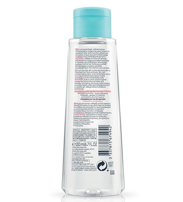 • Ingrédients Clés : Panthénol pour démaquiller en douceur | Eau Minéralisante de Vichy pour régénérer et réduire l’excès de sébum.