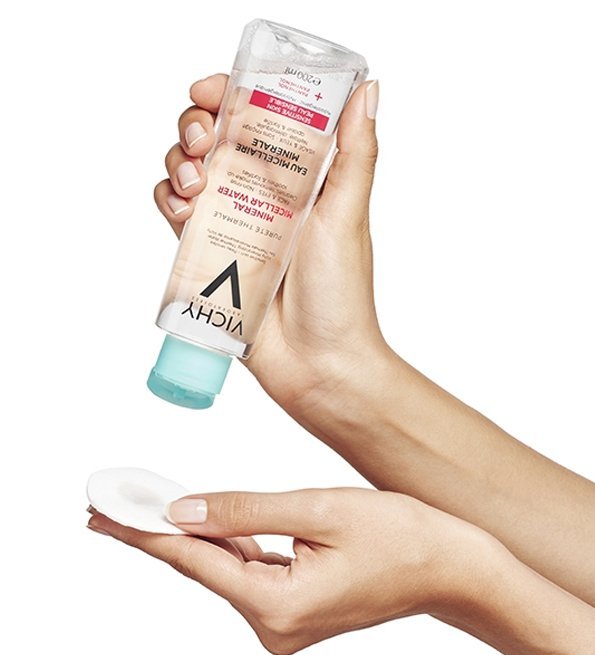 Une eau micellaire nettoyante, puissante enrichie d’Eau Minéralisante de Vichy et de panthénol apaisant